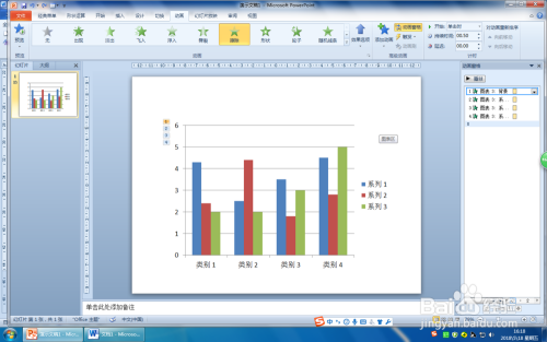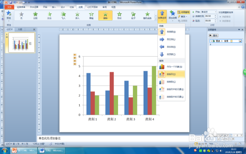 第四步:在“动画”组中单击“结果选项”按钮,在睁开的下拉列表中点窜默认的设置为“偏向:自底部”、“序列:按系列(或按类别、按系列中的元素、按类别中的元素)”。