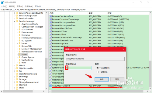 我们左键双击:AwayModeEnabled,在弹出的编纂 DWORD(32位)值对话框中,将 AwayModeEnabled 的数值数据从 1 更改为:0 ,再点击:确定;