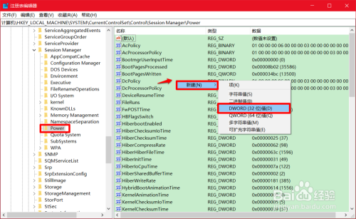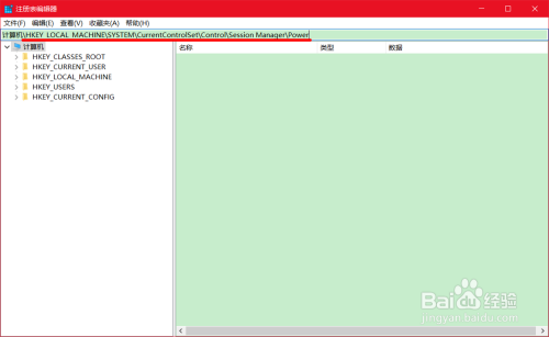 \HKEY_LOCAL_MACHINE\SYSTEM\CurrentControlSet\Control\Session Manager\Power 注册表路径到地址栏中;