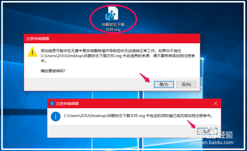 在系统桌面上找到并左键双击【休眠状况下载文件.reg】注册表文件图标,在先后弹出的注册表编纂器对话框中点击:是(Y)和确定。