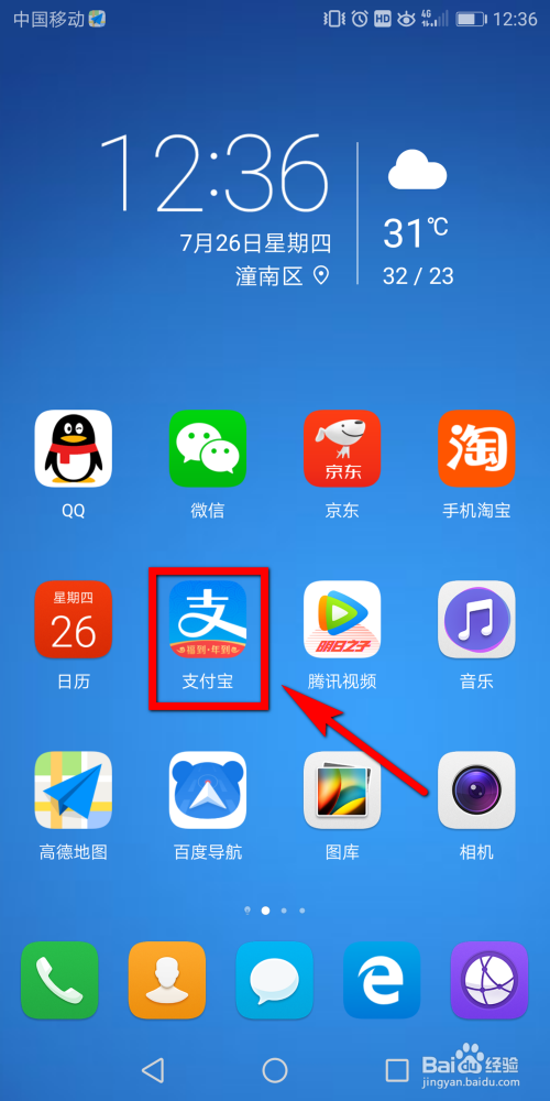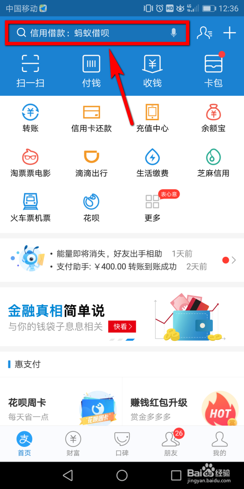 进入到付出宝首页今后,点击顶部位置的搜刮栏,如图所示。