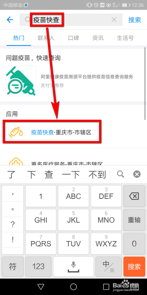在搜刮栏中输入疫苗快查,然后在搜刮成果中点击如图所示的应用。