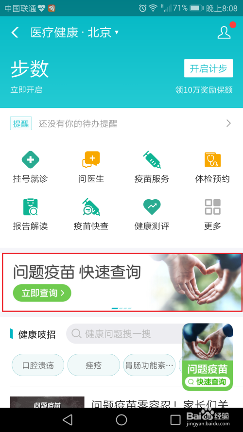 在医疗健康页面,找到“问题疫苗快速查询”的毗连,并点击;