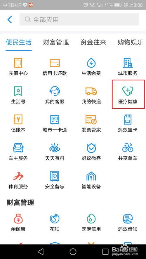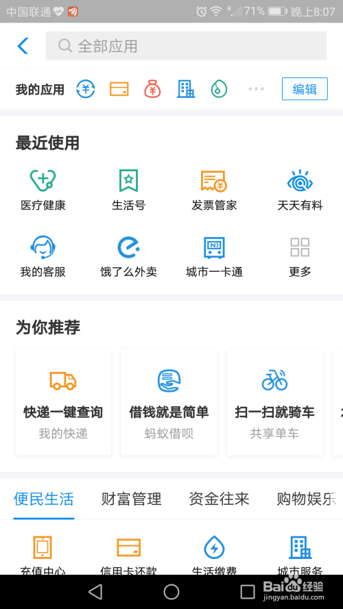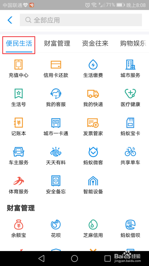 标的目的下滑动全数应用的页面,找到便平易近糊口的应用分类;
