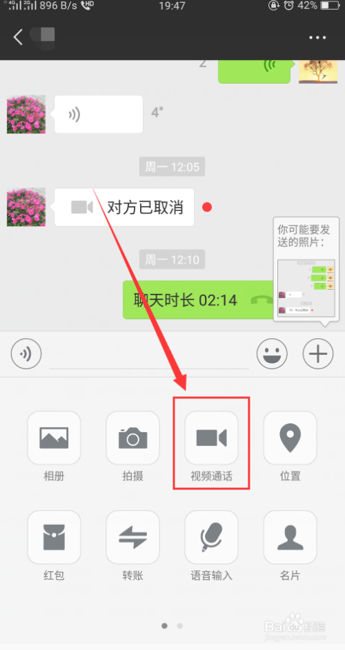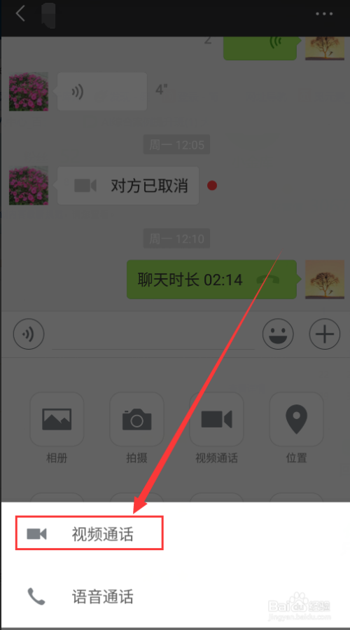 然后会弹出两个选项,别离是视频通话和语音通话,我们选择第一个【视频通话】。
