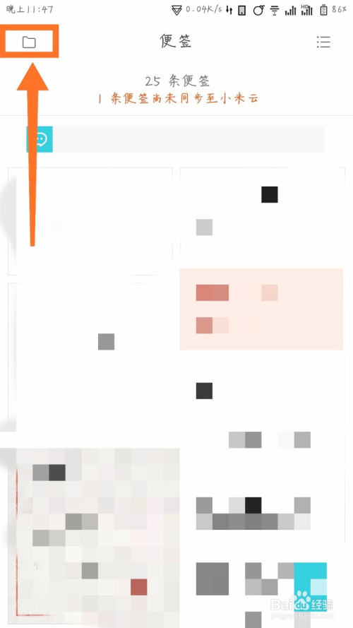 进入便签本家儿界面,看到左上方的文件夹的符号并点击。