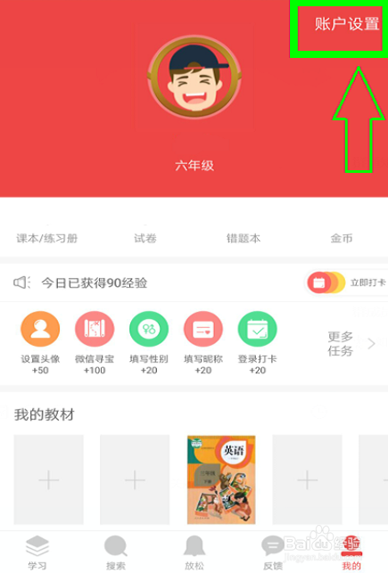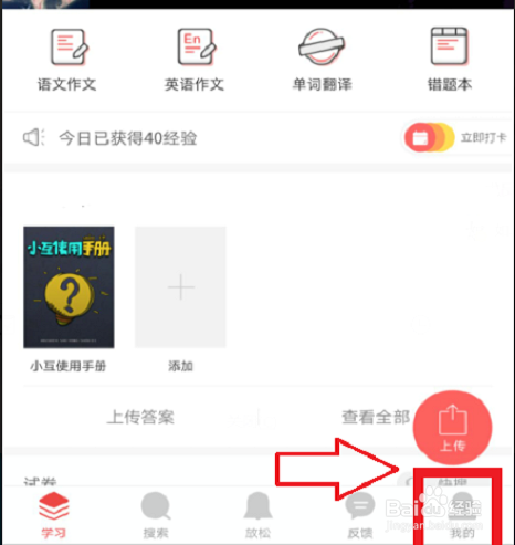 先点开互动功课的首呈页栏中,在最底下示到‘我的’灰钮,即为调更的进口,然后将此触进。