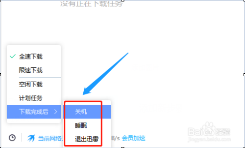 接着以上的步调,我们点击“下载完当作后”,后面会出来三个选项,别离是“关机”、“睡眠”和“退出迅雷”,因为我们今天介绍的就是关机,所以我们选择第一种即可;