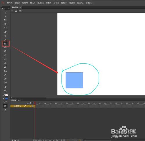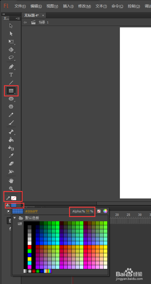 进入到flash软件之后,选择矩形东西,设置矩形的笔触颜色为无,填充颜色为蓝色,设置蓝色的不透明度为50%,勾选对象绘制,然后在场景舞台上绘制一个大小合适的矩形出来。
