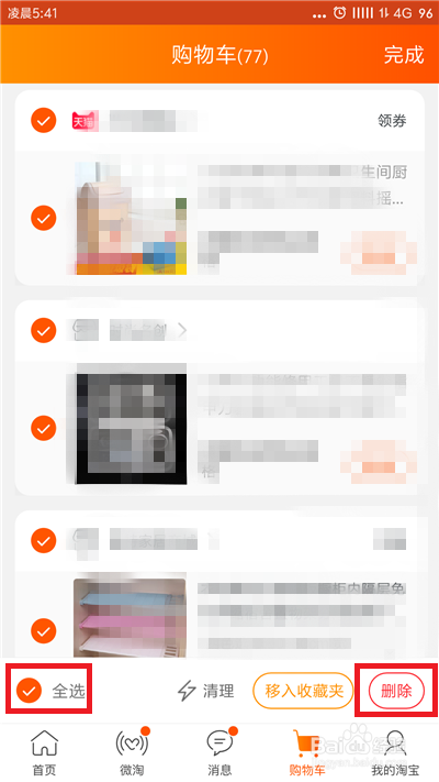 当然,我们也可以选择清空购物车,点击左下角的【全选】,如许购物车的物品就会被全数选择,在点击右下角的【删除】即可。