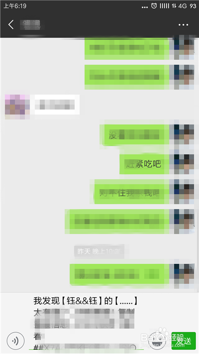 在聊天界面中粘贴适才复制的快口令,点击【发送】即可分享给微信老友。