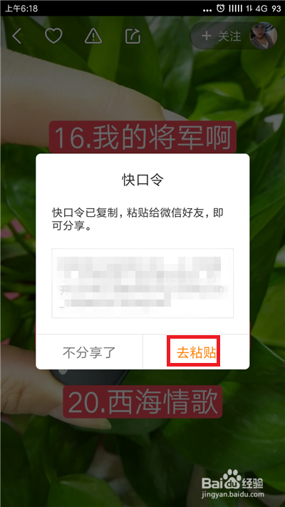 接下来系统会提醒【快口令】,快手把视频做当作了快口令,点击【去粘贴】。