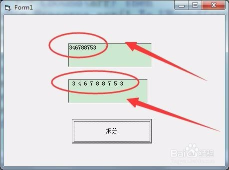 运行法式,单位格中输入一串数字,就拆分为单个数字。