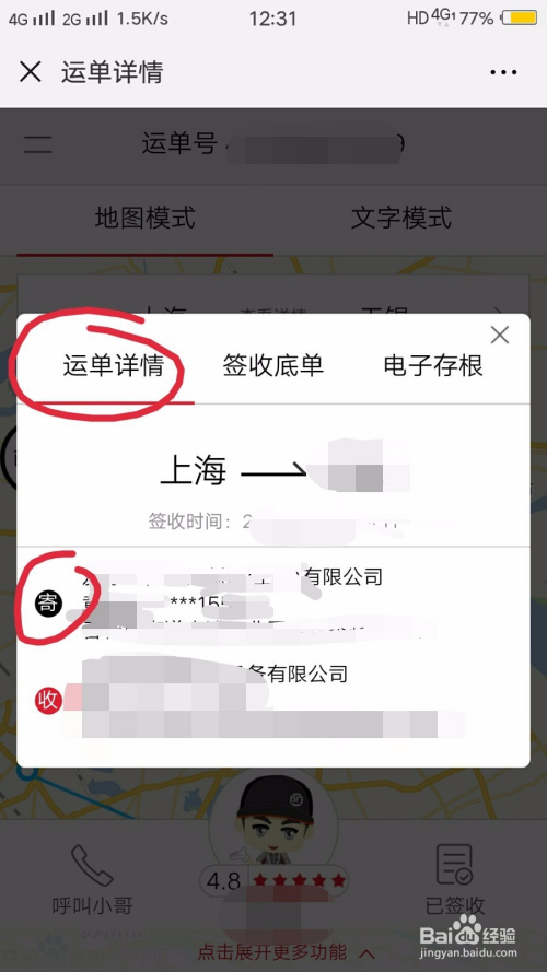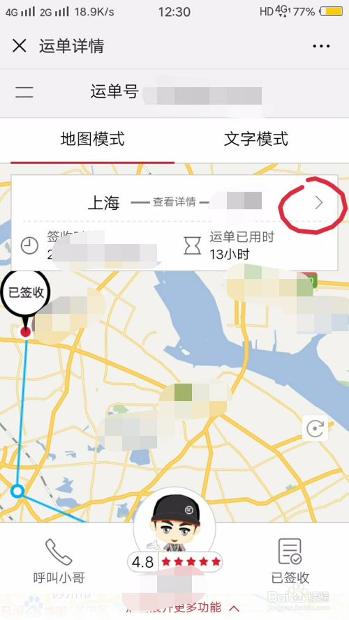 顿时就会显示运单的详情,这里会显示地图模式和文字模式,地图模式下,会有发送地址到收件地址的城市名称,在旁边有个箭头,我们点击阿谁箭头。