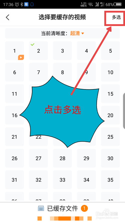 点击右上角的多选,不消一个一个的点击下载了,可以直接下载多个视频。