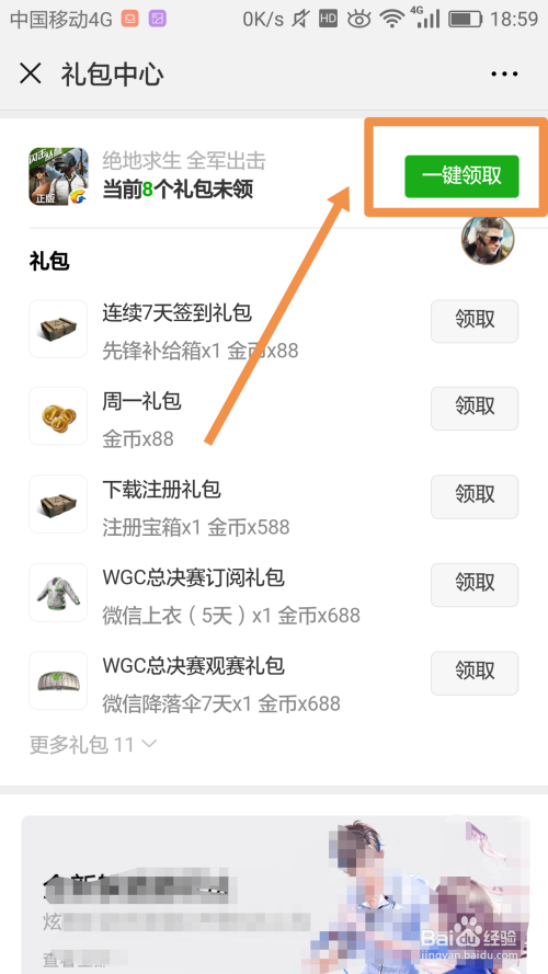 进入礼包中间,找到【绝地求生】游戏的【一键领取】按钮并点击,如图: