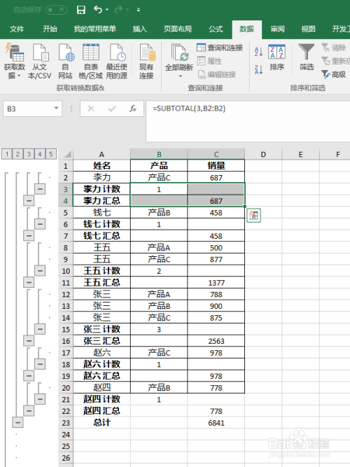 还可以对产物也做一个汇总。反复步调3,在分类汇总选项卡中选择汇总体例为“计数”,汇总项为“产物”,不勾选“替代当前分类汇总”,勾选了这项之后,就会删除之前的汇总。