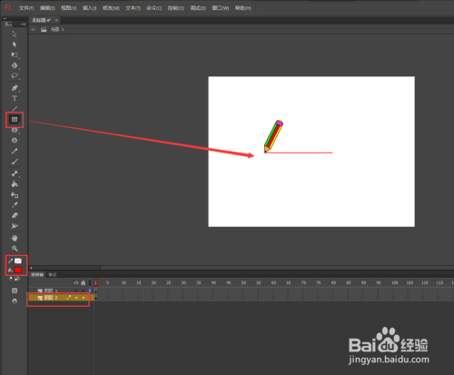新建一个图层2,将图层2移到图层1的下方,然后选中图层2,选择矩形东西,设置矩形的笔触颜色为无,填充颜色为红色,然后在舞台中画出一条线条出来;按Ctrl+加号键放年夜舞台,将小铅笔与线条的左侧进行对齐。