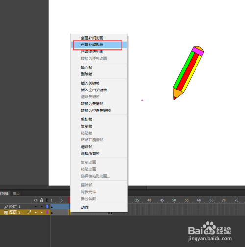 别离在图层1和图层2的第25帧按F5插入一个帧,在零丁选中图层1,在图层1第1帧与第25帧之间右键鼠标建立一个补间动画,将鼠标定位到图层1的第25帧位置,选中小铅笔,按住shift键程度移动小铅笔,将小铅笔移到线条的右侧。