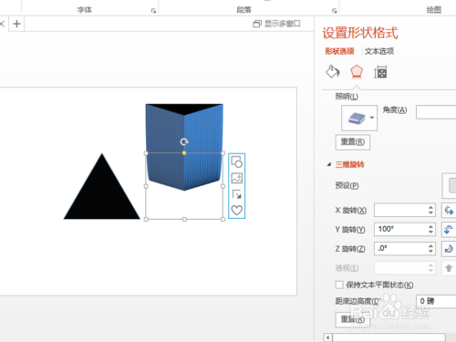 复制一个三角形,调出设置外形格局窗口,切换到结果选项,设置三维格局中的顶端棱台高度为200.