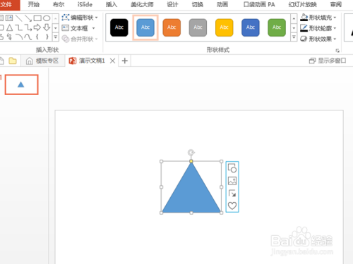 首先启动ppt2013,执行插入菜单,选择三角形,并按住shift键绘制一个正三角。