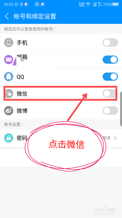 点击设置打开账号设置界面,点击最下面的账号和绑定设置选项。
