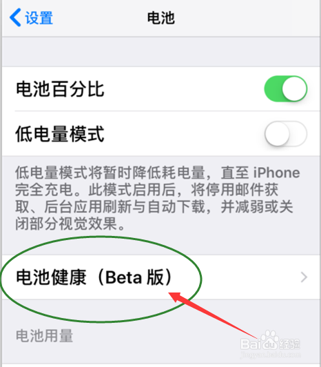 点击打开电池选项后呈现电池本家儿界面菜单,点击——电池健康(beta版)选项。