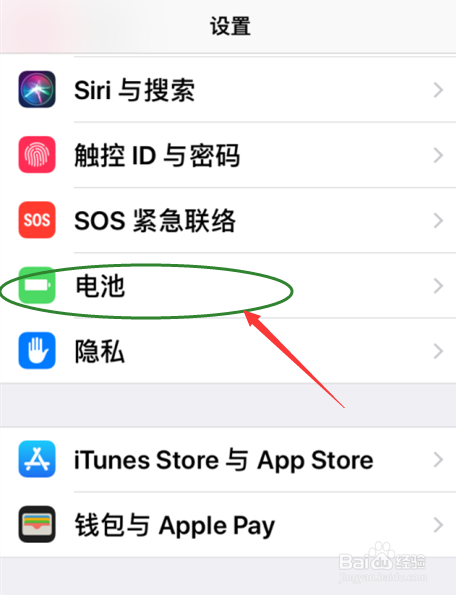 点击打开设置选项本家儿页面后,下拉菜单找到(电池)选项点击打开。