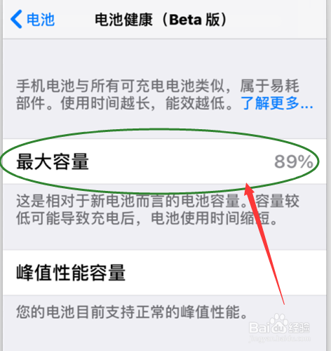 点击电池健康(beta版)选项后,显示电池的最年夜容量,若是最年夜容量过低电池达到经久极限不克不及用(坏了)。