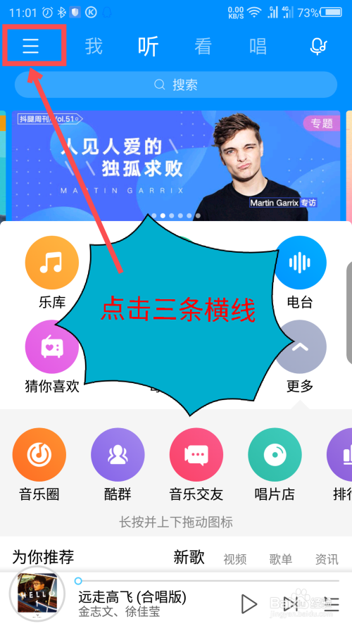 打开酷狗音乐,在软件首页点击左上角的三条横线。