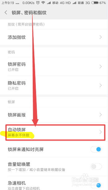 然后在打开的 锁屏、密码和指纹 页面中可以看到一个 主动锁屏选项。