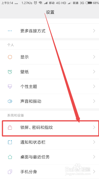 然后会打开一个设置页面,在这个页面中找到锁屏、密码和指纹选项,点击它。