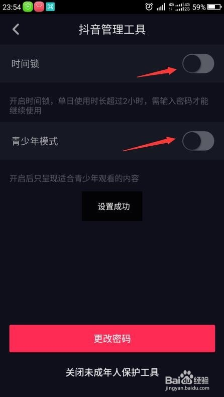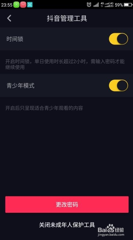 点击时候锁右侧的滑块,即可开启时候锁(跨越2小时需要密码方可利用),点击青少年模式右侧的滑块可开启只呈现适合青少年不雅看的内容。