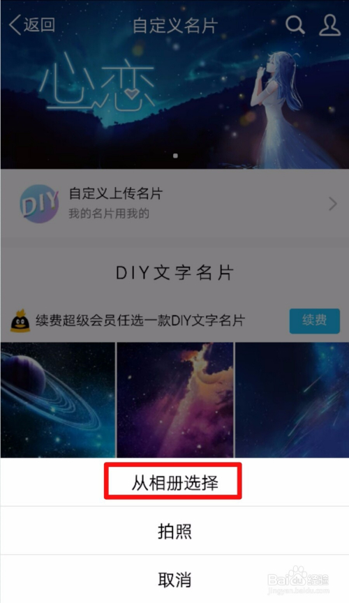 然后在弹出的新窗口点击【从相册选择、或者摄影】,肆意选择一个就可以了,若是需要在相册选择图片,那么我们就选择【从相册选择】就好了。如图所示