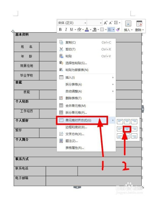 发现文字都不是居中状况,我们把表格全选中,然后点击鼠标右键,“单位格对齐体例”,点选最中心的居中体例(程度垂直全居中)即可。