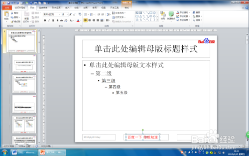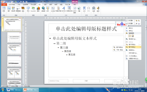 第二步:单击左侧缩略图窗格最上面的幻灯片母版(最上面的一个幻灯片是幻灯片母版,下面的一组小一点的幻灯片是与该母版相关的幻灯片版式),或者单击自界说的幻灯片母版。