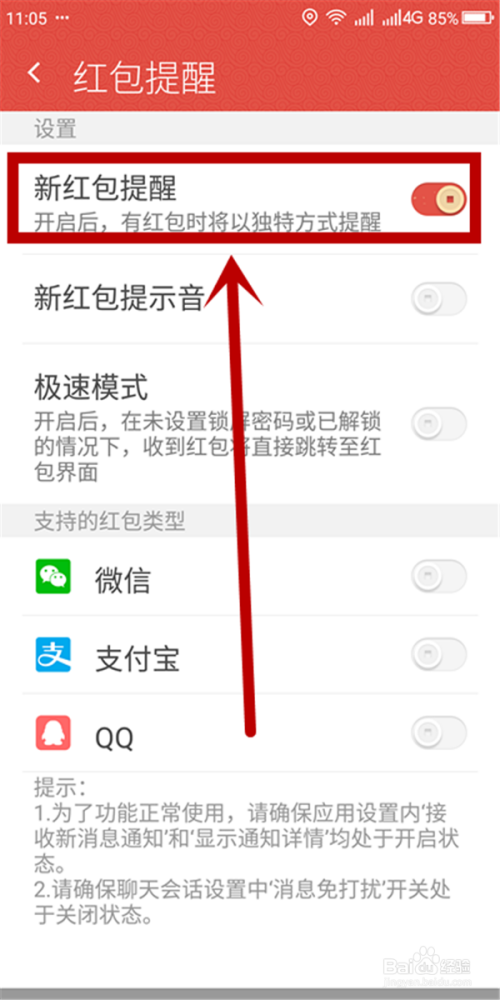 在红包提醒页面,我们首先要点击“新红包提醒”,将红包提醒功能打开