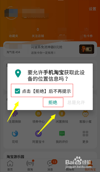 回到本家儿页,提醒要位置,勾选拒绝后不再提醒,然后点击拒绝按钮,如下图所示