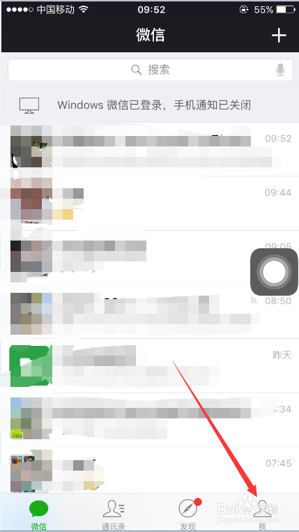 首先登岸微信,进入微信首页聊上帝面板,点击右下角的“我”,进入微信小我中间,如图所示。