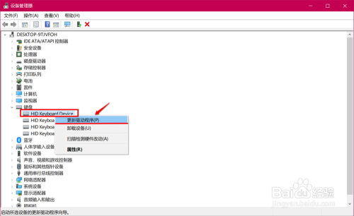 在键盘的睁开项中,右键点击:HID Keybord Device(HID键控装配),在右键菜单中点击:更新驱动法式;
