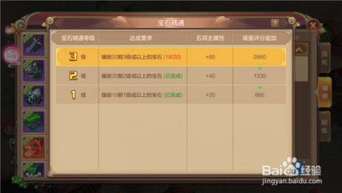 第八步,我们看左侧第三个前提,要求镶嵌3级宝石的数目达到20颗,今朝我已达到18颗,这个同样需要必然数目的银币,同时,这个宝石也可以经由过程做使命随机获得。我们点击【前去镶嵌】就可以达到宝石镶嵌界面,如下图所示。