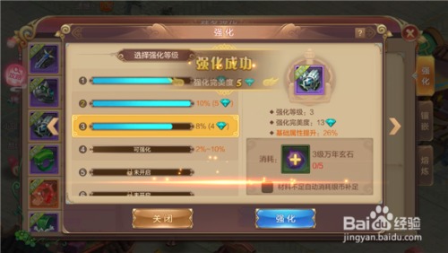 第七步,我们再看左侧第二个前提,装备的强化钻石数目必需达到200。我们点击【前去强化】,跳出如下图所示的菜单,这个就是装备的强化菜单,经由过程点击下方的强化,可以对装备进行品级强化。