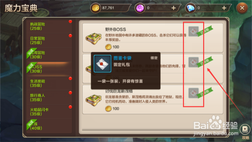 我们可以在魔力宝物新版本更新之后,在魔力宝典页面直接领取“图鉴卡袋 ”,打开这些图鉴卡袋每一个卡袋可以获得一张宠物图鉴卡, 我们就有几率获得赤目螳螂判定卡 。