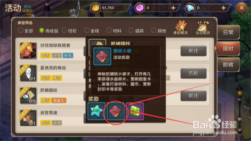 我们也可以在魔力宝物首页面的左上角处找到并点击“活动 ”按钮,在活动面板的限时活动里可以找到“抓捕猫妖 ”这个活动,我们可以经由过程这个活动获得5袋猫妖小袋,开启猫妖小袋我们可以有几率获得赤目螳螂的宠物图鉴卡 。