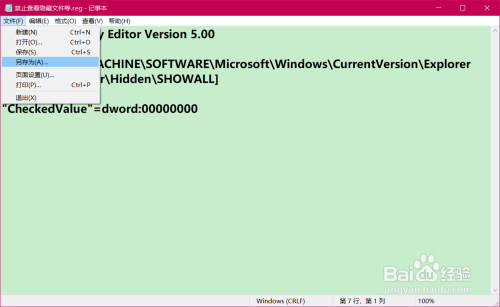 按照建造建造【禁止查看埋没文件等.reg】注册表文件的方式,建造 一个【恢复查看埋没文件等.reg】的注册表文件添加到注册表中。添加到注册表中;