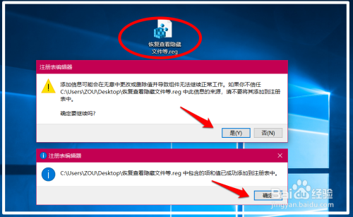 回到系统桌面,我们找到并左键双击【禁止查看埋没文件等.reg 】注册表文件图标,在先后弹出的注册表编纂器对话框中点击:是(Y)和确定。