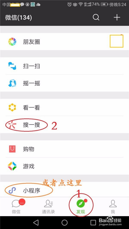 首先是登录微信,在界面底部的“发现”栏目,点击“搜一搜”或是“小法式”。