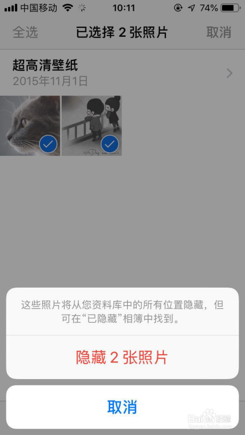 点击后,就会弹出埋没照片提醒:这些照片将从您的资料库中的所有位置埋没,但可以在“已埋没”相簿中找到,我们选择埋没照片即可完当作埋没。