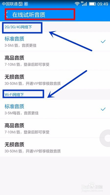 最后在打开的该项设置页面中可以看到数据流量环境下的音质选择和WiFi环境下的音质选项,这时,我们可按照本身的需要进行选择即可。