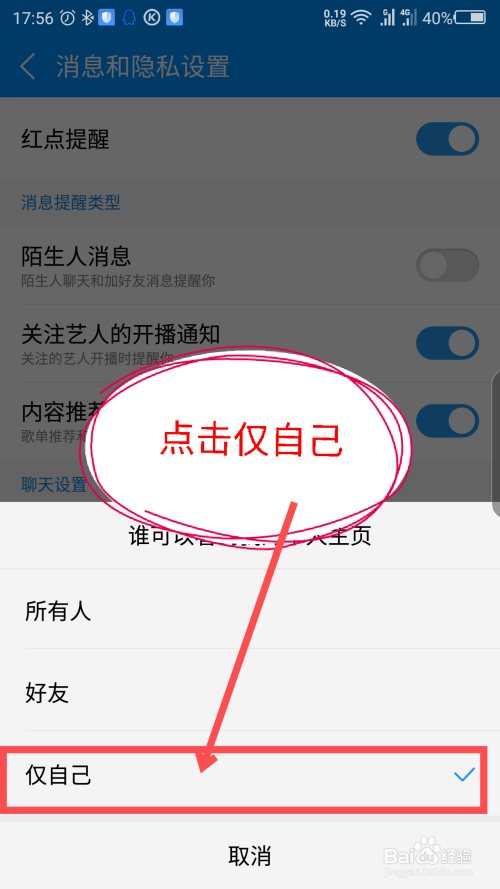 点击后,从底部会划出一个窗口,选择谁可以看到我的小我本家儿页选项,点击仅本身。